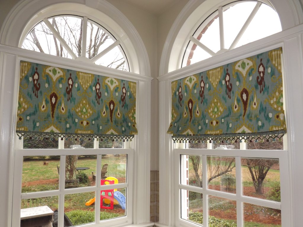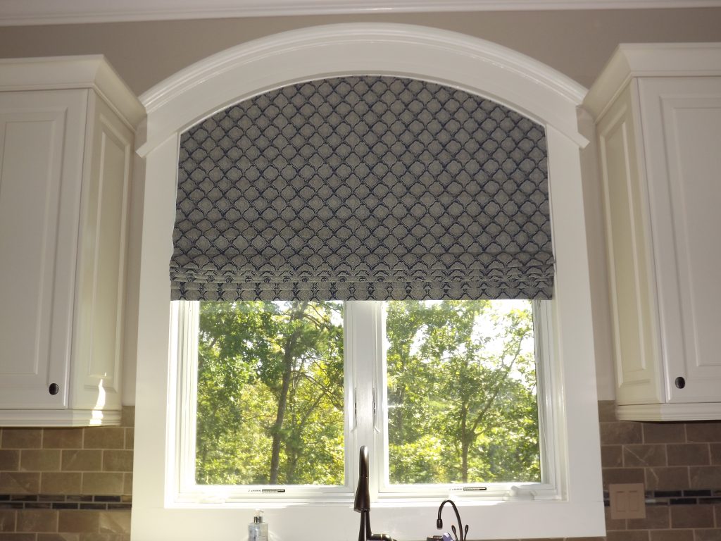 Elegant Roman shades custom-fitted to specialty-shaped windows for a clean, functional design.