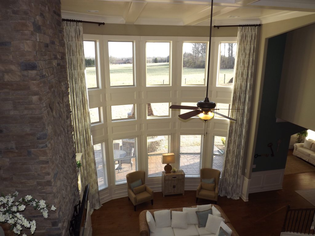 Floor to ceiling drapery installed in a two-story living area created visual appeal and scale. - Roman Shades – Anderson, SC